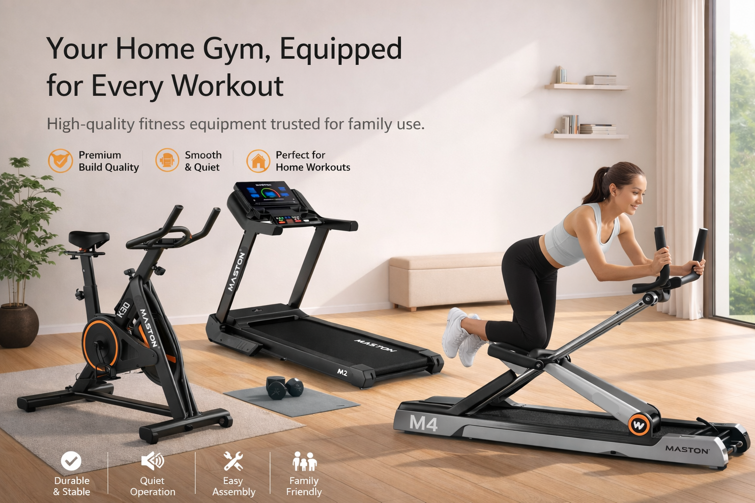 Maston Fitness delivers high-quality treadmills, exercise bikes, and gym stations built for performance, stability, and comfort. Crafted from durable materials with precision finishing, our equipment ensures smooth motion and long-lasting reliability. Elevate every workout with power, efficiency, and style, bringing professional-grade fitness into your home.