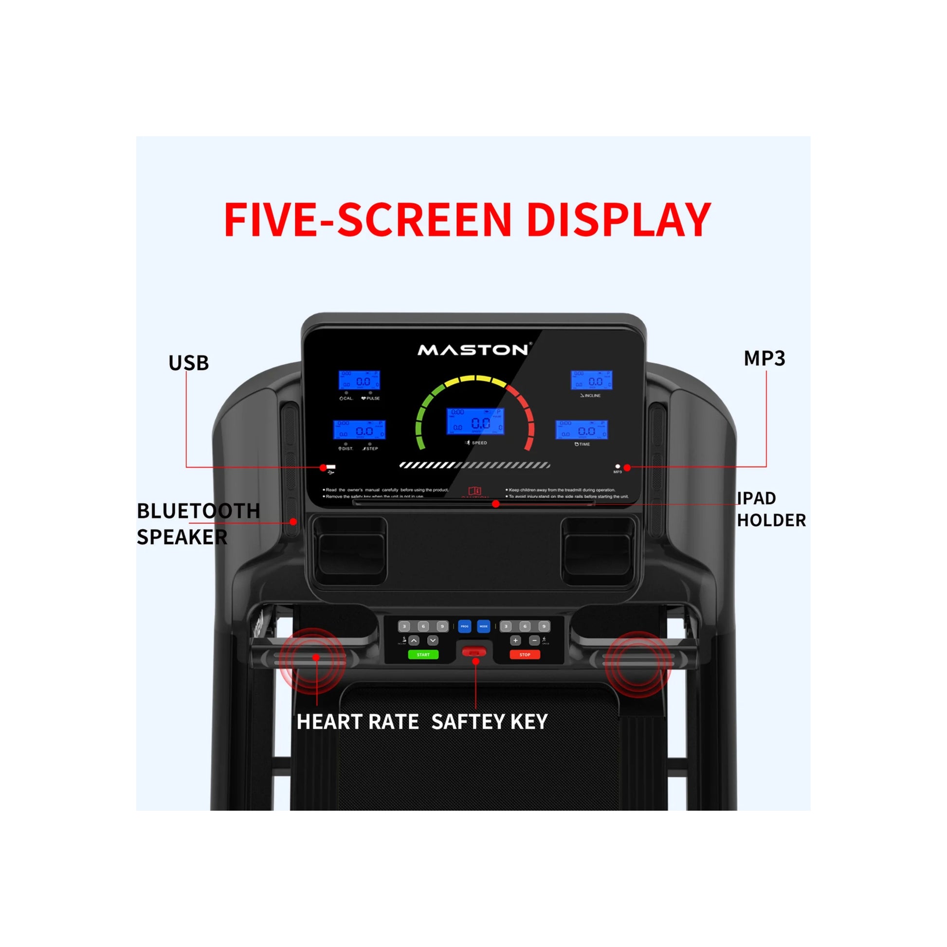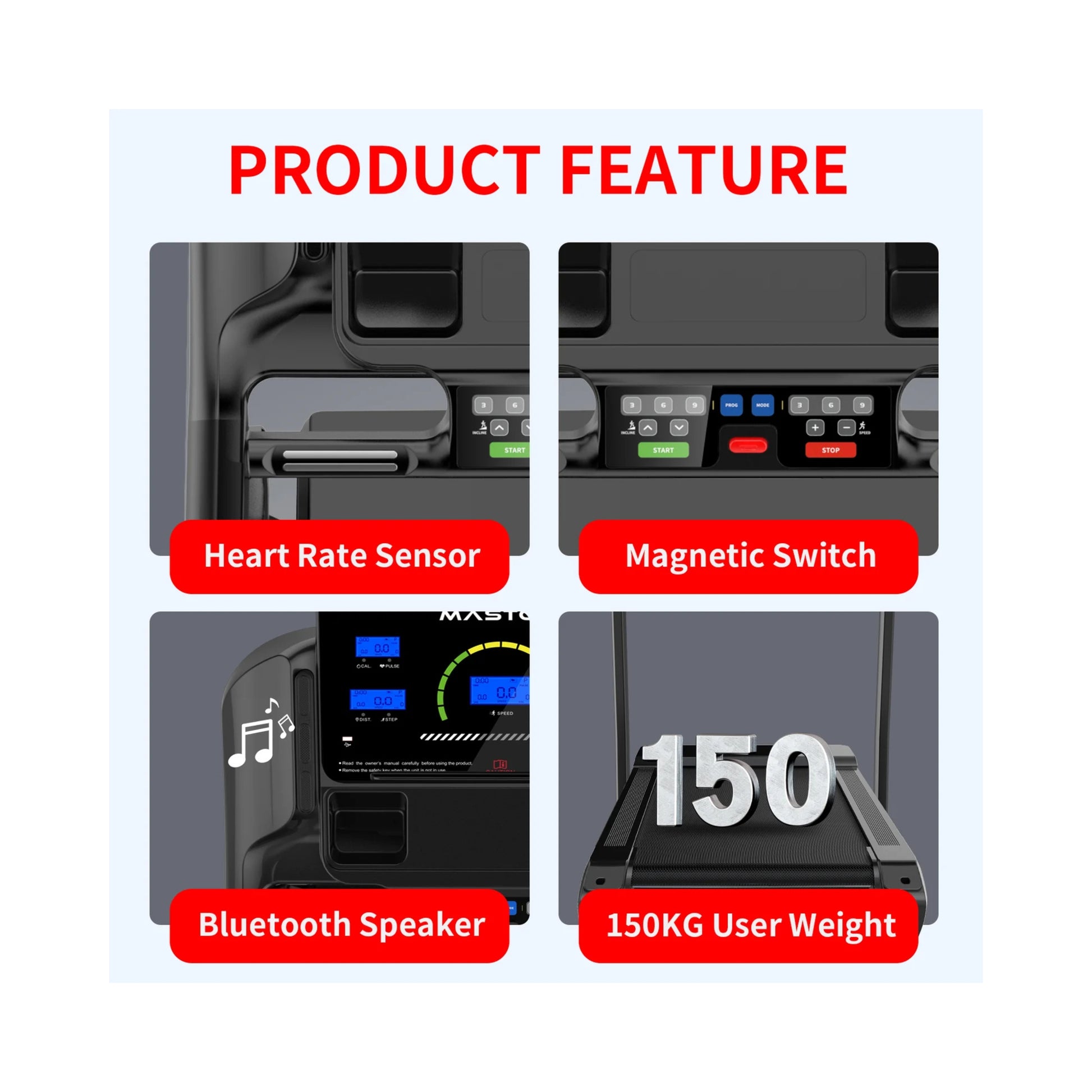 - قوة المحرك القصوى 4.5 حصان، وسرعات عالية تصل إلى 20 كم/ساعة، وميل تلقائي بنسبة 20%. مساحة جري واسعة: 1450 × 530 مم، وحزام جري بسماكة 2 سم. طبقة احتكاك خاصة تعزز الثبات. أقصى حمولة 150 كجم.