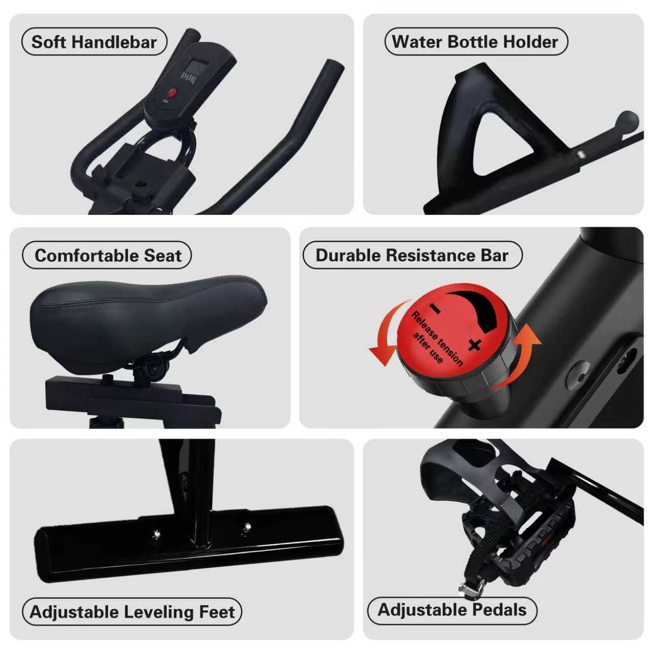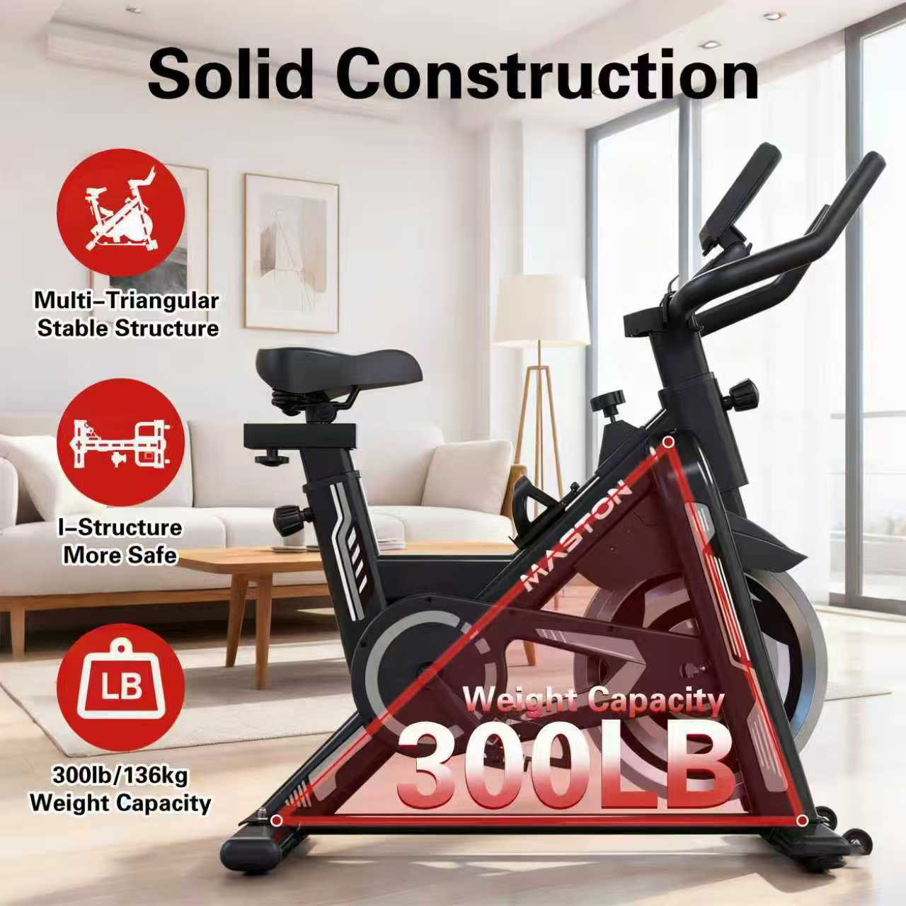 - هيكل عالي الجودة وثابت: تتميز هذه الدراجة الرياضية بإطار أنبوبي مُحسّن ومُقوّى، وتصميم هيكلي متعدد المثلثات، يتحمل وزنًا يصل إلى 120 كجم. تتغلب على عدم استقرار معظم الدراجات الرياضية المنزلية المتوفرة في السوق، مما يوفر لك تجربة ركوب آمنة.