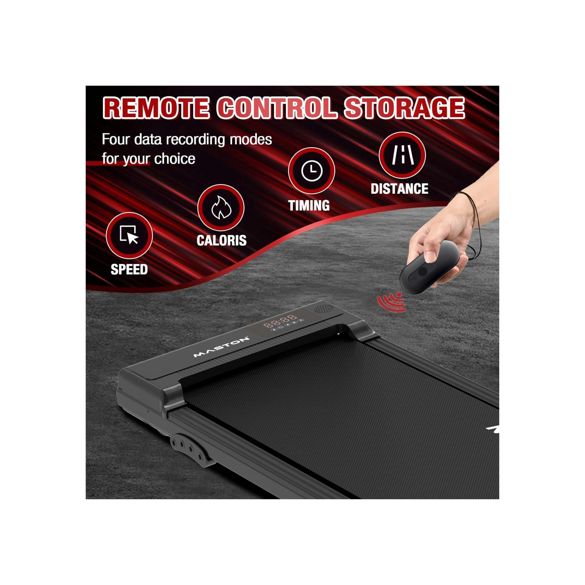- TRACKING DISPLAY: The MASTON treadmill is designed with an LED screen that displays speed, distance, time and calories burned, allowing you to visualize your workout and stay motivated. You can control the speed or stop the treadmill by pressing the remote control.